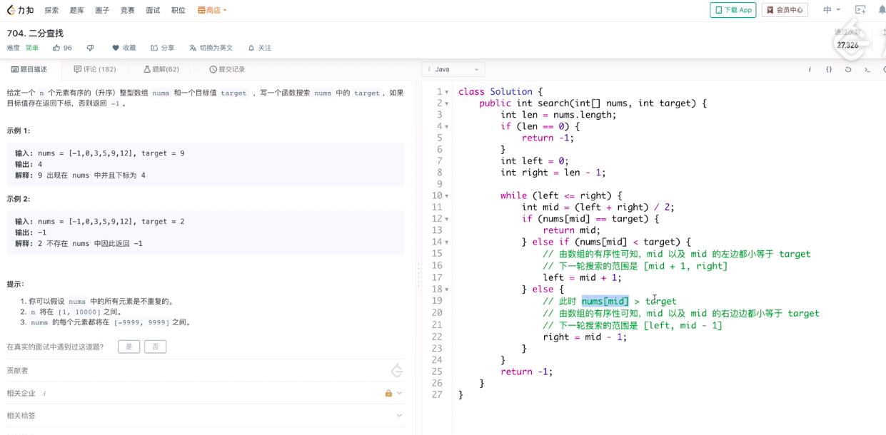 if (nums[mid] > target) { // 往左半部找